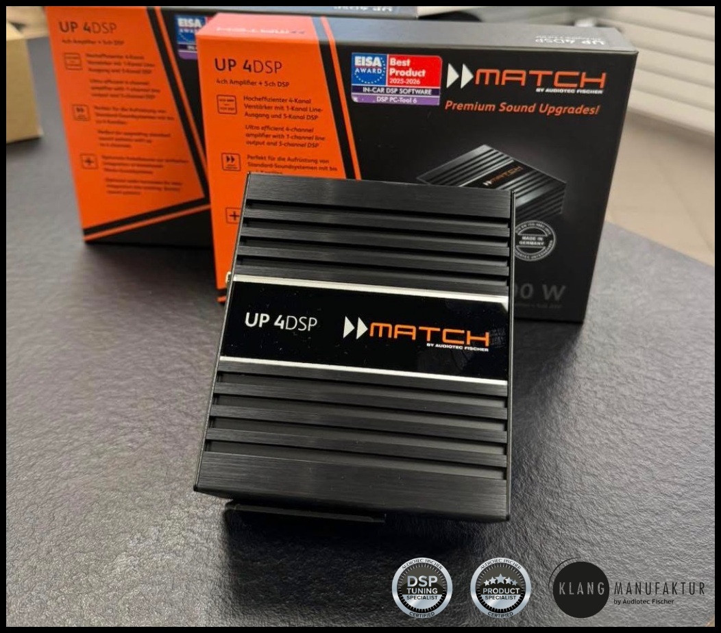 Die UP 4DSP erweitert das MATCH UP Lineup um einen kraftvollen 4-Kanal-Verstärker mit integriertem 5-Kanal-DSP: Die ideale Lösung für Fahrzeuge mit einfachen 2- oder 4-Kanal-Werksradios, bei denen ein deutlich hörbares Klang-Upgrade gefragt ist – ohne die Komplexität großer Mehrkanalverstärker. Sie wurde speziell dafür entwickelt, serienmäßige Soundsysteme effizient aufzuwerten und gleichzeitig eine saubere, unauffällige Integration im Fahrzeug zu ermöglichen.